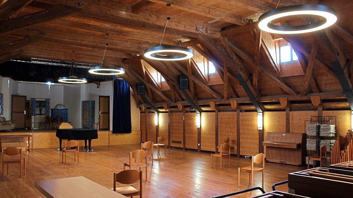Die neu installierten kreisrunden Deckenlampen sorgen für eine bessere Beleuchtung im Pfarrsaal. Der Boden wurde geölt.