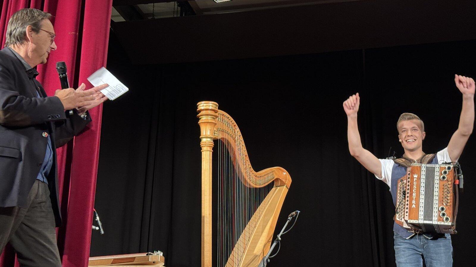 Komplett ausverkauft war die Stadthalle am Freitagabend. Der erst 23-jährige Kollnburger Tobias Probst trat zum ersten Mal solo auf, mit einem musikalischen Benefiz-Kabarettprogramm mit Harfe, Steirischer, Zither und