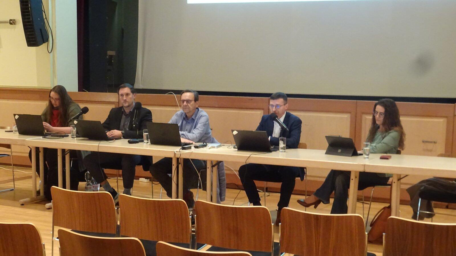 Bürgermeister Franz Wittmann (3.v.l.), Kämmerer Matthias Wittmann (4.v.l ) und Monika Häuslmeier, Leiterin der Tourist-Info (r.), berichteten bei der Bürgerversammlung der Stadt Viechtach in der Stadthalle.