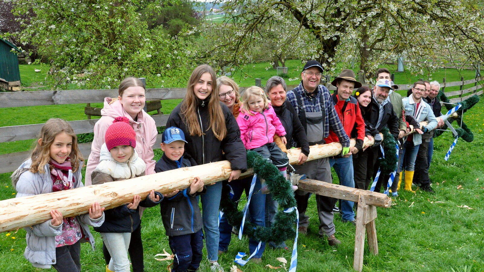 Die vereinigten Siegersdorfer präsentieren mit Stolz ihren Maibaum vor dem Aufstellen.