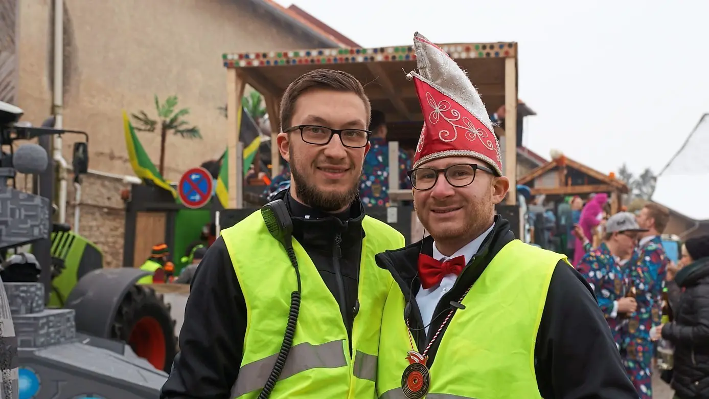 Alexander Märkl, 1. Präsident des Faschingskomitees Köfering (l.) und Ehrenpräsident Manuel Hagen (r.), hier vorm Start zum letzten Gaudiwurm, kündigten Einlasskontrollen auf mitgebrachte Alkoholika für den Faschingszug 2019 an.