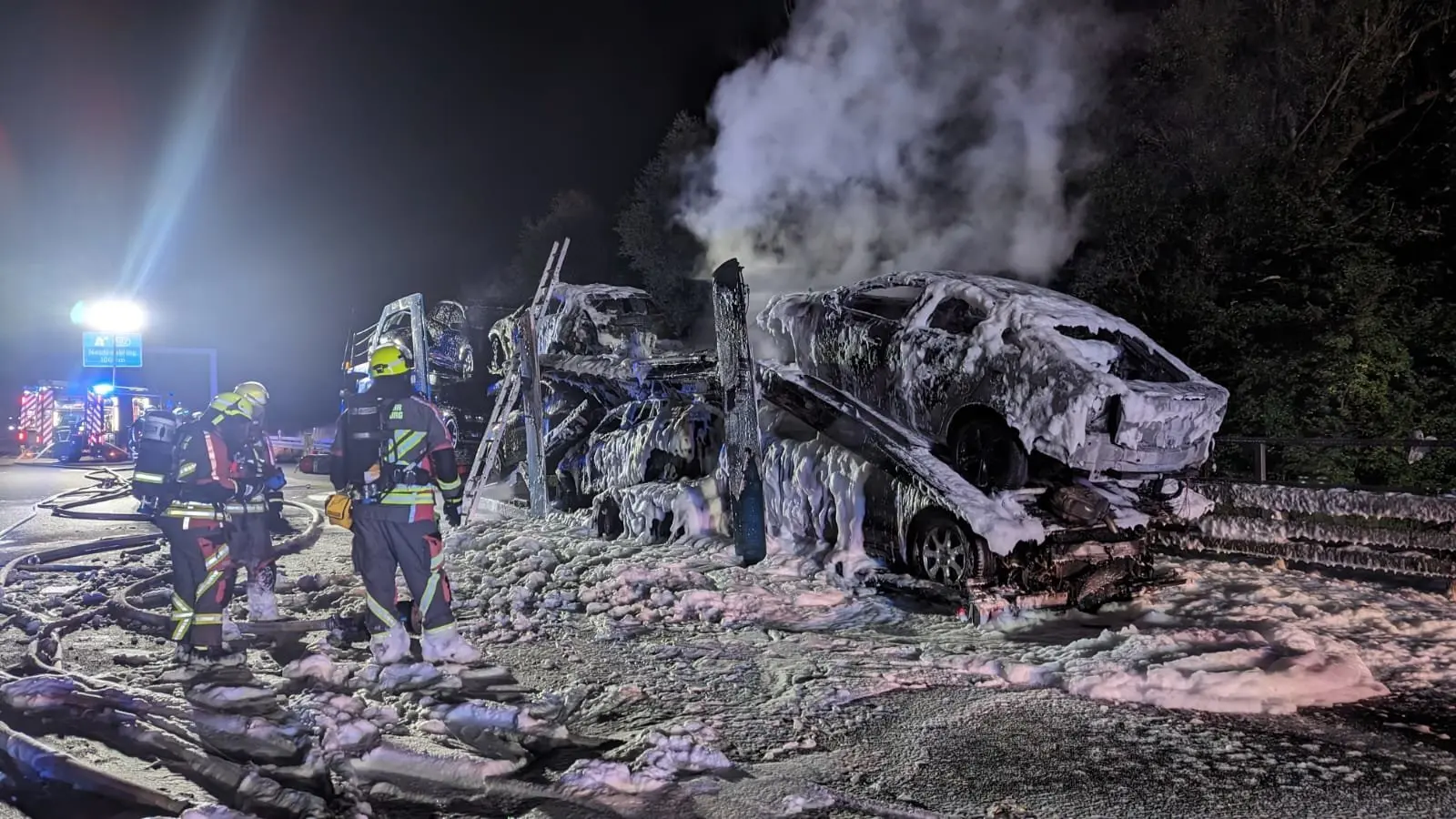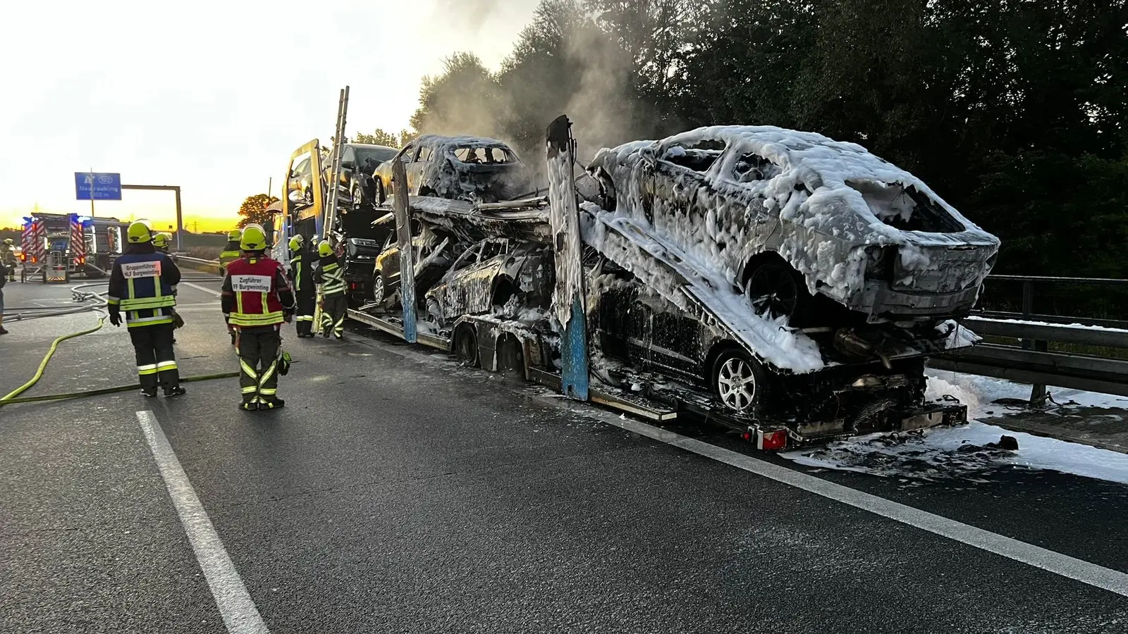 Ein Transporter fing laut Polizeibericht zwischen den Anschlussstellen Regensburg-Ost und Neutraubling um 4.35 Uhr zu brennen an. Der Transporter sei mit neun Autos beladen, die ebenfalls zum Teil brannten. Es handele sich um keine E-Autos. Verletzt sei niemand.