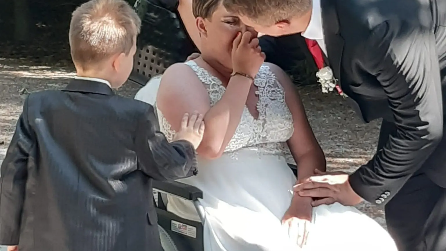 Zusammen mit Tante Maria geht es für die 23-Jährige im Brautkleid nach Wiesent, wo sie Michael und ihre beiden Söhne Bastian und Elias schon erwarten. Bei allen fließen die Tränen, auch für die Helfer ist es ein ergreifender Moment. Eine professionelle Fotografin hält ihn auf Bildern fest, ehe sie mit dem Hospizmobil weiter zur Kirche St. Petrus in Wörth an der Donau fahren. Dort wartet bereits der Vater der Braut zusammen mit Pfarrer Johann Baier und der Hochzeitsgemeinde. Als Baier die Trauformel spricht und das Brautpaar die Ringe austauscht, kullern auch hier bei einigen Gästen die Tränen. Vor der Kirche lassen Selina und Michael noch zusammen Tauben fliegen und stoßen gemeinsam auf die Zukunft an.