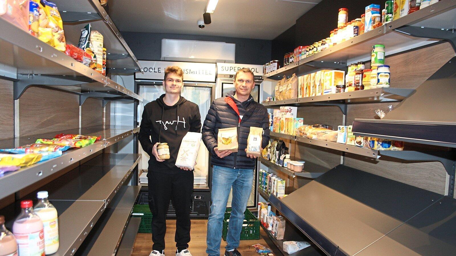 Noch sind nicht alle Regale im einladenden Container eingeräumt, aber Platz ist überraschend groß im kleinen Minimarkt. Konstantin Gatzke und sein Sohn Kevin werden die Regale auch mit vielen regionalen Produkten füllen.