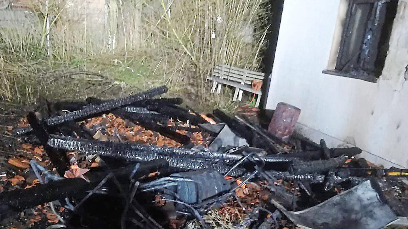 Nur verkohlte Reste sind von dem Häuschen übrig. Auch die Wand des angrenzenden Wohnhauses wurde bei dem Brand beschädigt.