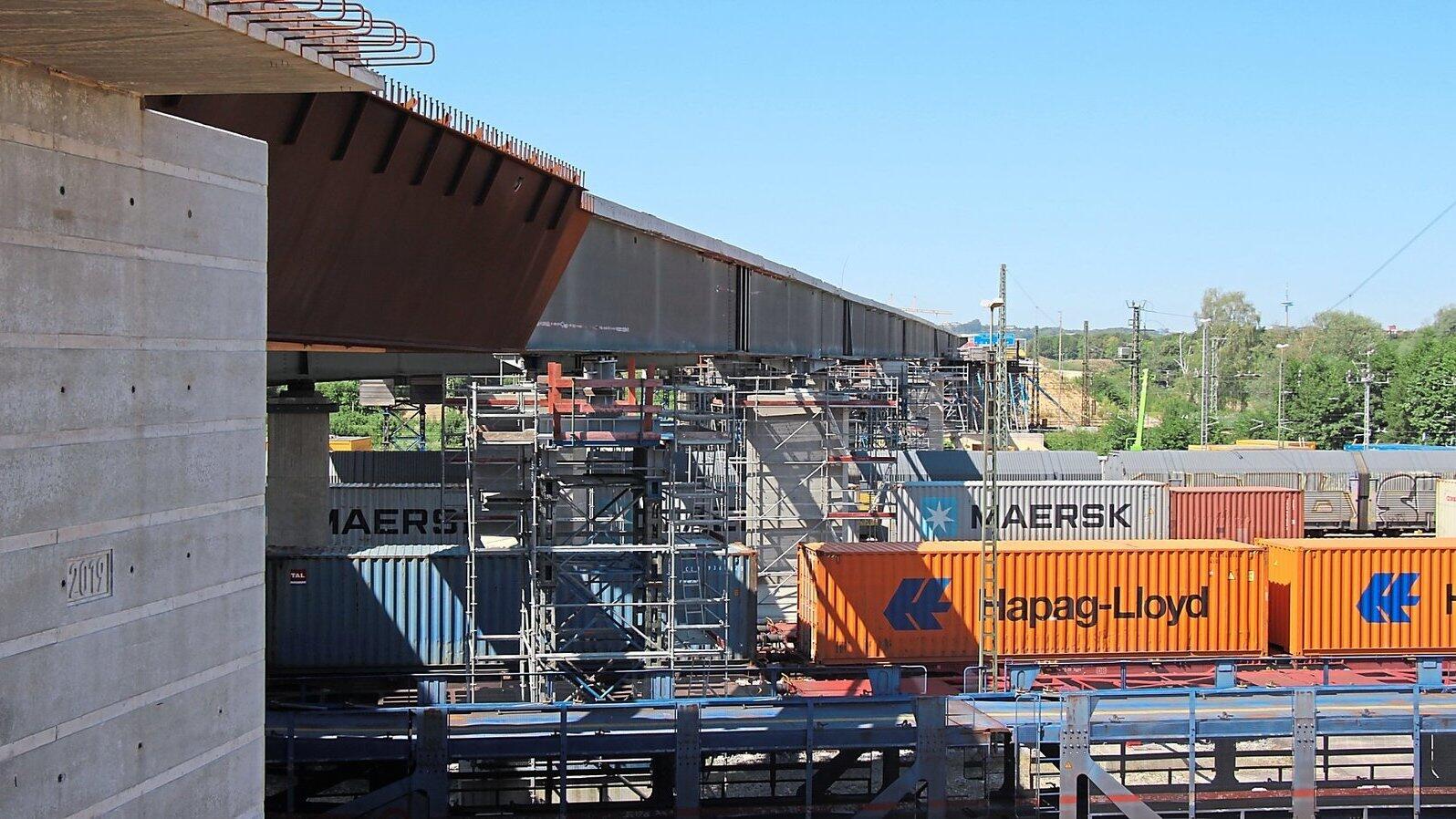 16 Meter ragt der neue Stahlhohlkasten hier schon heraus. Dahinter schließt die alte Konstruktion aus den 60er Jahren an. Nun konnten die gut 90 Tonnen schweren und rund 25 Meter langen Stahlteile erfolgreich nacheinander eingeschoben werden, um die alte Brücke zu ersetzen.