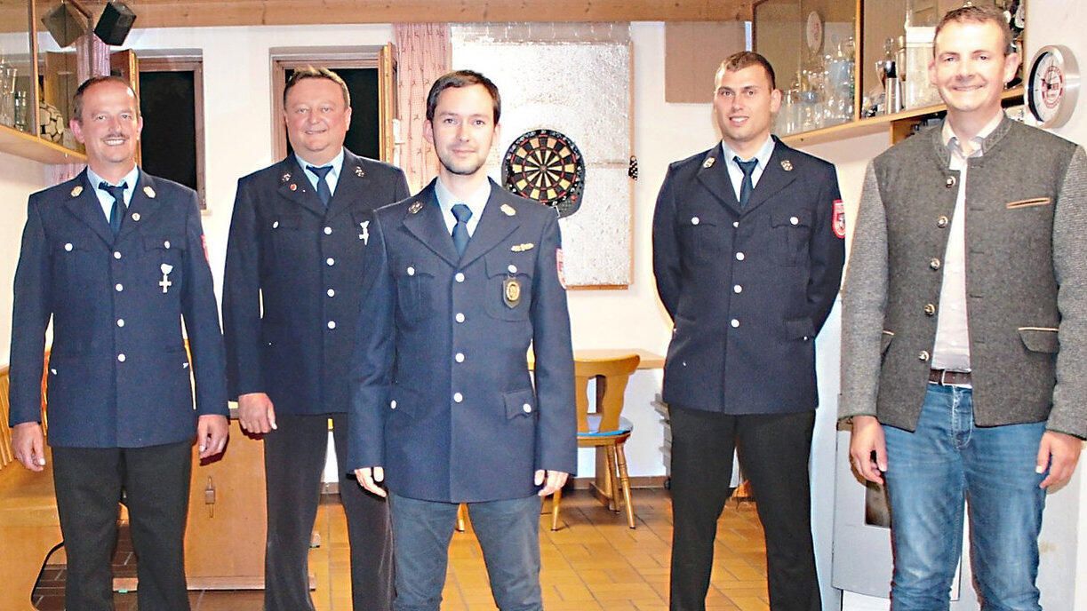 Der Vorstand und die Kommandanten wurden in der Jahresversammlung gewählt. Von links: Hans Glöbl, Martin Stadler, Paul Roßmann, Maximilian Neßlauer, Markus Amann, 2. Bürgermeister Martin Kreutz.