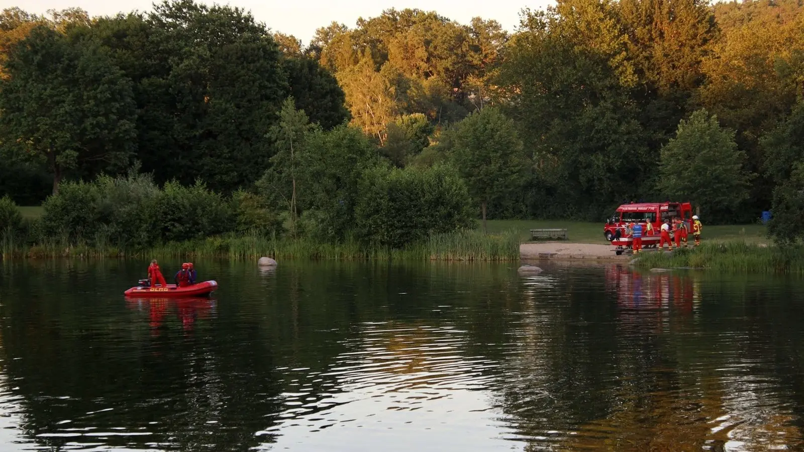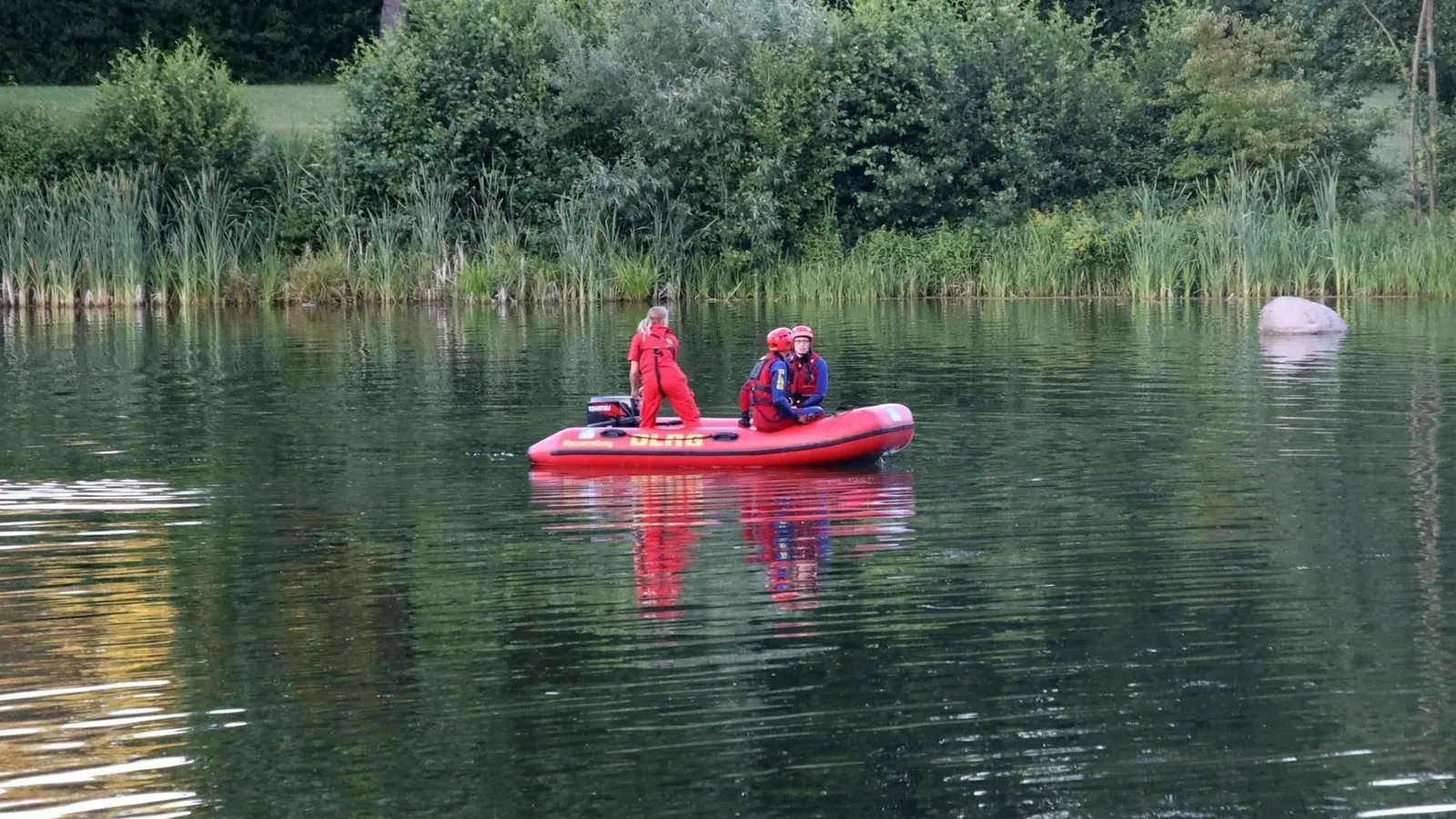 Taucher und Rettungsboote der DLRG Regensburg am Dienstagabend im Schwetzendorfer Weiher. Dort wurde die Leiche eines 55-jährigen Mannes geborgen.