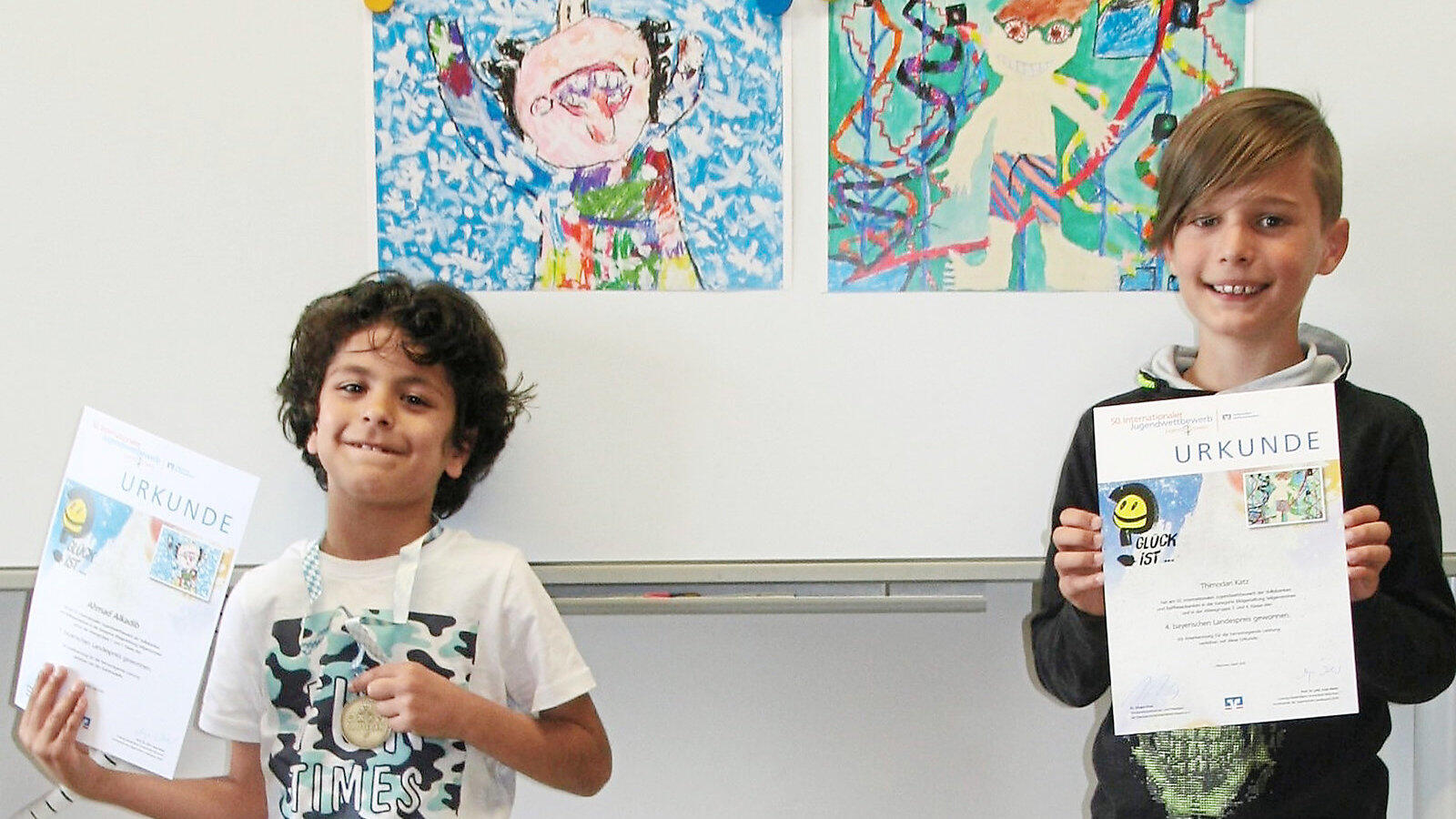 Zwei Schüler der Hermann-Zierer-Grundschule in Obertraubling malten bundesweit die schönsten Bilder in ihrer Altersgruppe beim 50. Internationalen Wettbewerb "jugend creativ".