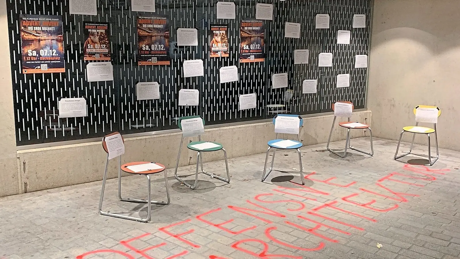 Die bunten 8.000-Euro-Stühle, die nun offiziell im Boden verankert wurden, erzürnen wiederum das "Kollektiv Fußabdrücke". Inzwischen kam es zu acht Aktionen vor Ort. Auf Bannern und mit Kreide auf dem Boden wird von "eingeschränktem Sitzverbot" und "feindlicher Architektur" gesprochen. "Kein Platz für Menschlichkeit?", lautete zudem am ersten Adventswochenende die Frage auf einem Banner. Man solle sich melden, wenn man eine Bank übrig habe, da die Stühle natürlich nur eine Übergangslösung seien, hieß es. Eine Telefonnummer leitete an das städtische Bauamt weiter. Der Zwist zwischen Stadt und Aktivisten dürfte weitergehen.