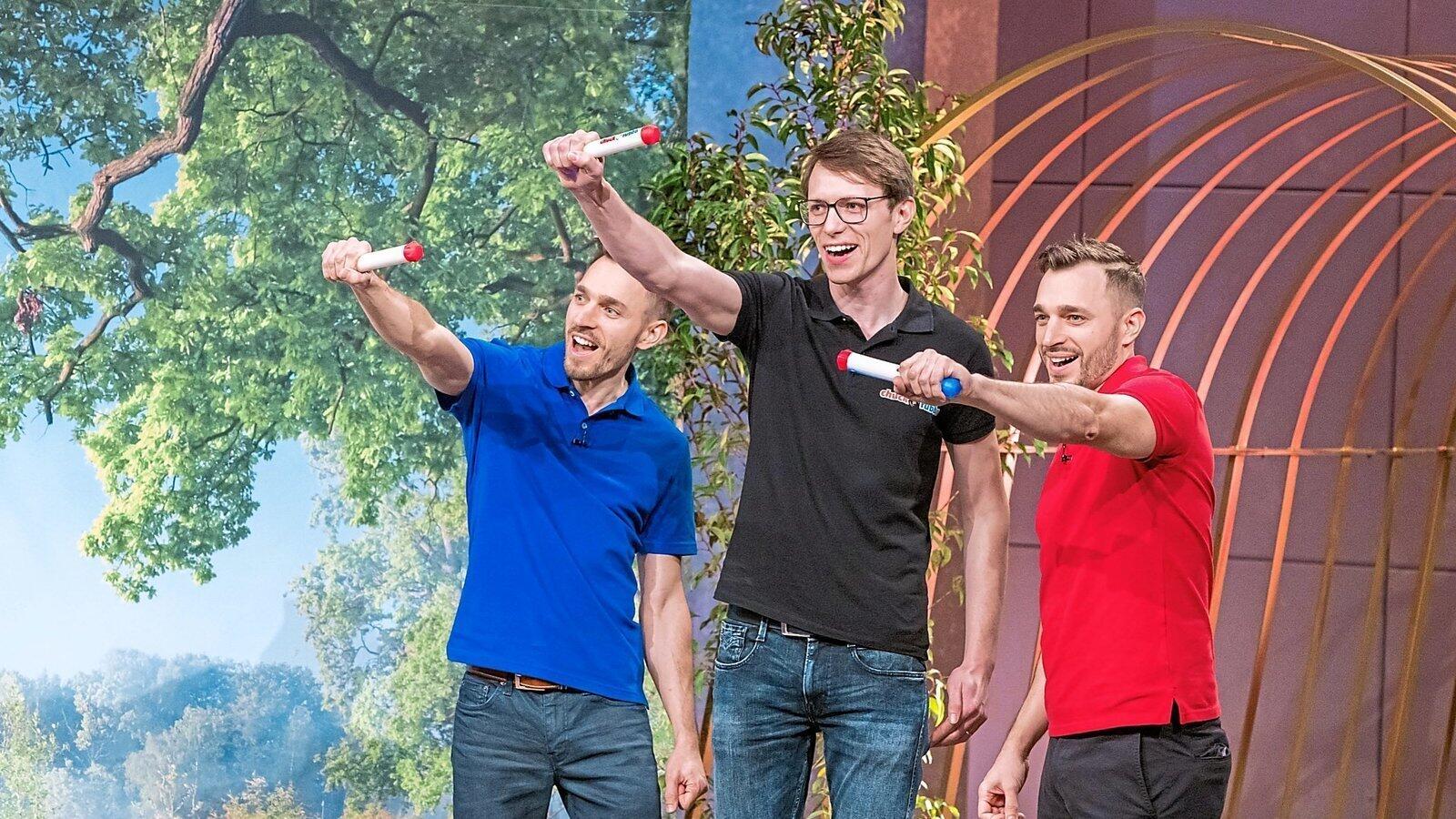 Rainer Lauberger (l.) und Thomas Moch (r.) präsentierten mit Thomas Eichstetter ihr elektronisches Wurfspielzeug. Heute kümmern sie sich im Hintergrund um technische Details.