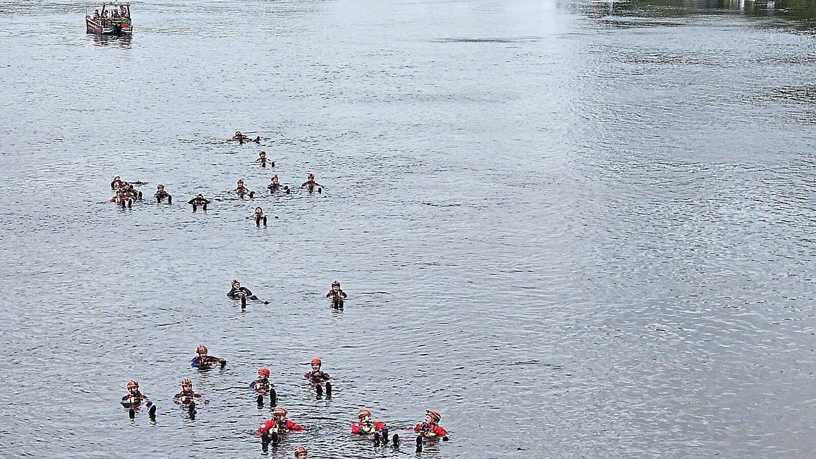 Eine Übung im Rahmen der Fließwasserretter-Ausbildung der BRK-Kreiswasserwacht absolvierten Donnerstagmittag gut zwei Dutzend Männer und Frauen in der Donau beim Eisernen Steg.