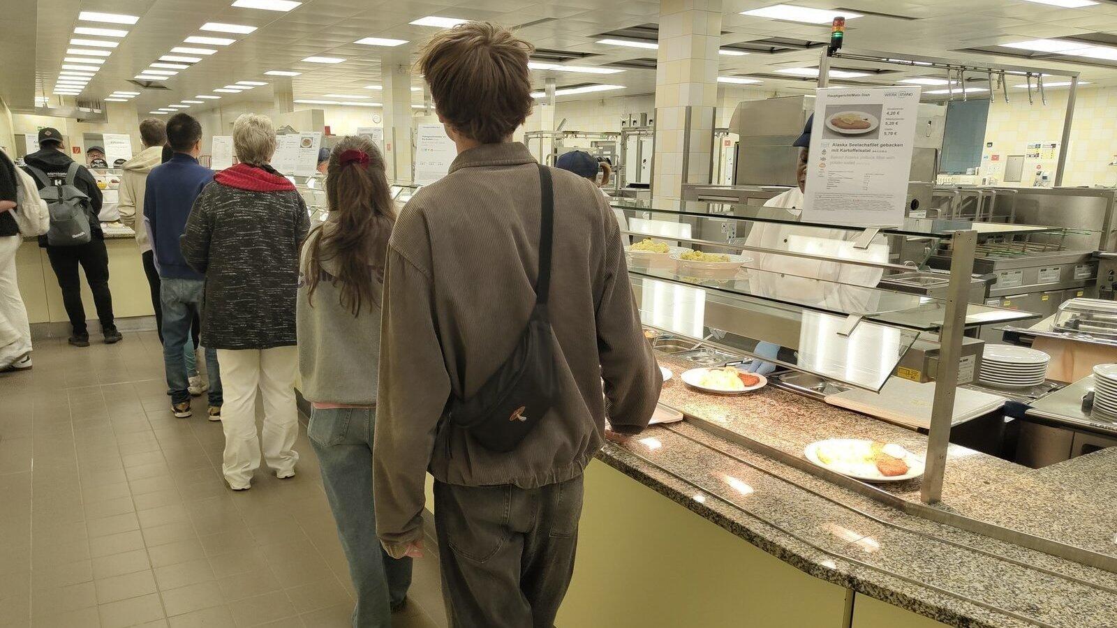 Lena Schmidt und Felix Bernard gehen an der Ausgabe der uni Mensa direkt an den Fleisch-Gerichten vorbei auf die veganen und vegetarischen Optionen zu.