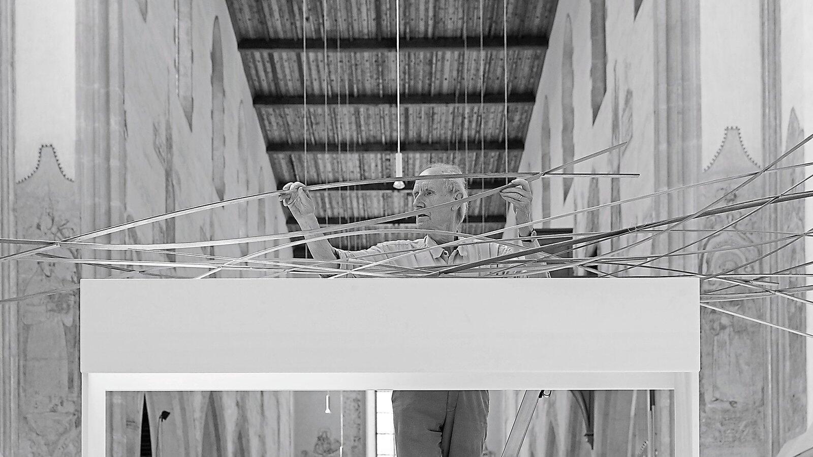 Peter Dorn 2021 beim Aufbau seiner Installation "Linea X" in der Minoritenkirche.