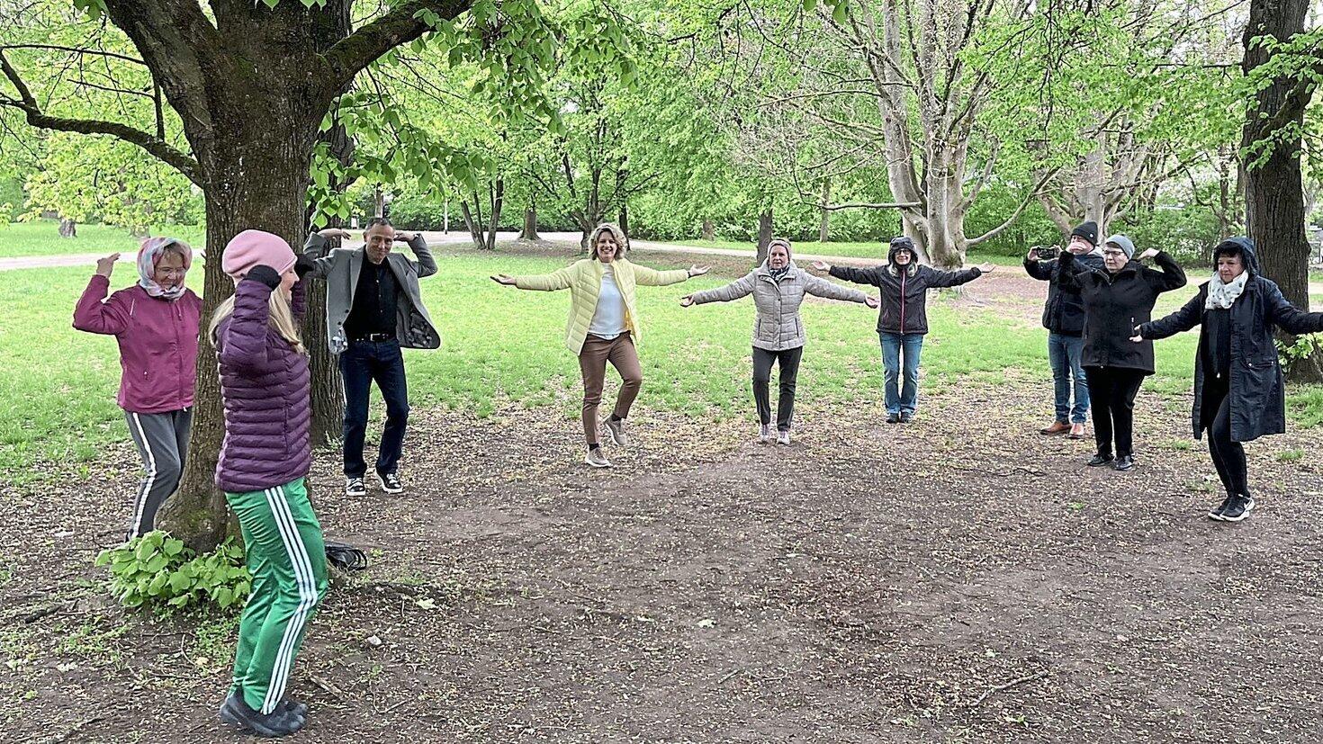 Vor dem Baum steht Andrea Blank und weist ihre Sportsfreunde an. Mit dabei sind auch Astrid Freudenstein und Christian Goß. Die gestrigen Übungen sollten den Rücken stärken.