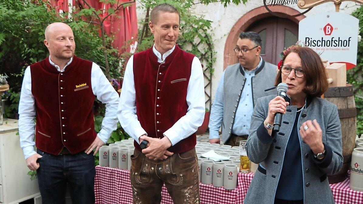 Braumeister Darko Zimmer (von links), Bischofshof-Geschäftsführer Till Hedrich und Oberbürgermeisterin Gertrud Maltz-Schwarzfischer begrüßten die Gäste im Bischofshof am Dom.