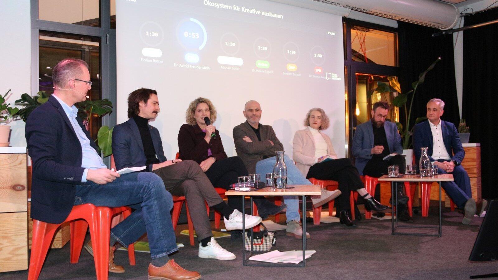 Moderator Christian Omonsky (von links) diskutierte mit Florian Rottke (Brücke), Astrid Freudenstein (CSU), Michael Schien (Freie Wähler), Helene Sigloch (Grüne), Benedikt Suttner (ÖDP) und Thomas Burger (SPD) darüber, wie in Regensburg ein florierendes Ökosystem für Kreative geschaffen werden kann.
