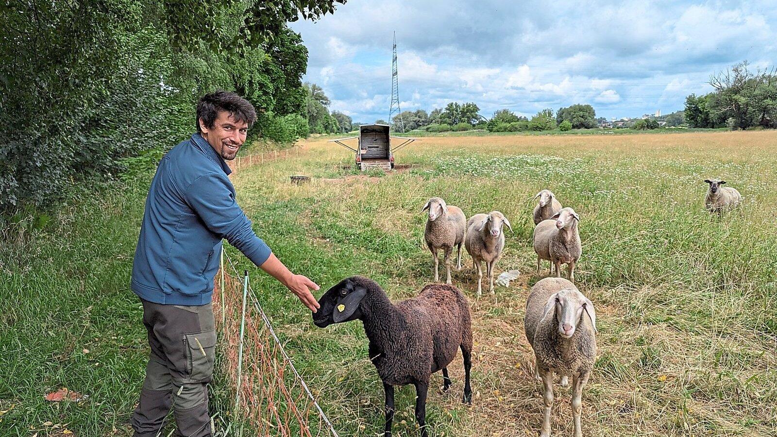 Natur- und Landschaftspfleger Severin Eggerdinger mit der kleinen Merino-Herde, die gerade einen früheren Acker an der Äußeren Wiener Straße ökologisch umwandelt und aufwertet.