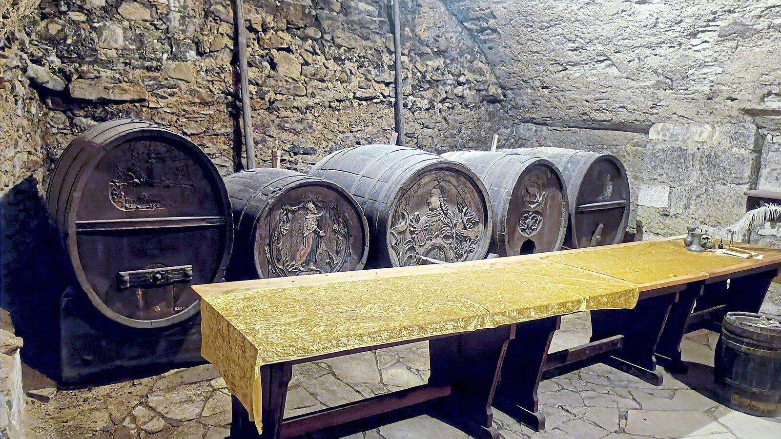 Im Weinkeller unterm Regensburger Rathaus schlummern verzierte Fässer