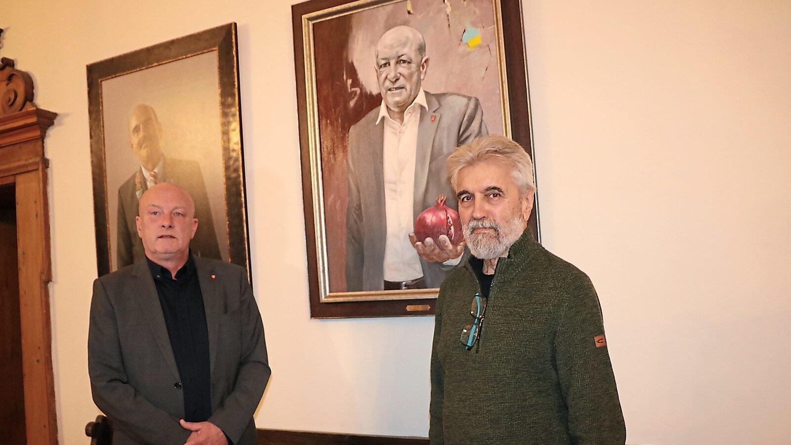 Joachim Wolbergs (links) und Oleg Kuzenko vor dem Porträt des ehemaligen Oberbürgermeisters.