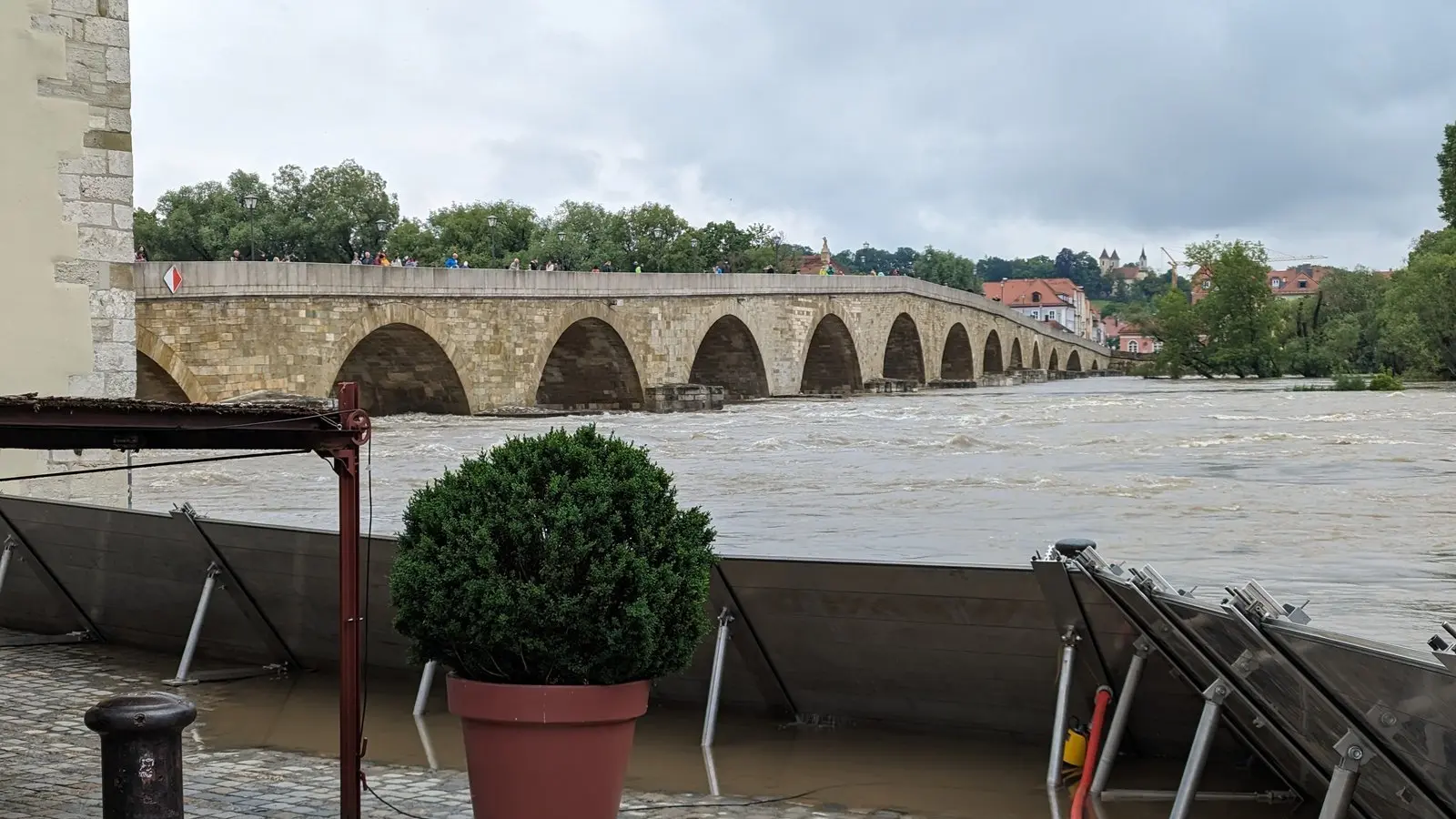 Am Sonntagvormittag hat der Pegel der Donau an der Eisernen Brücke in Regensburg die Fünf-Meter-Marke und damit die Hochwasser-Meldestufe 3 überschritten. Während des Tages und im Lauf der Nacht kamen dann die ersten großen Wassermengen aus dem Regental und von der oberen Donau. Wie die Stadt am späten Sonntagnachmittag mitteilte, soll der Pegel des Hochwassers von 2013 aber nicht erreicht werden. Entwarnung gibt es deshalb nicht. Der Höchststand wird erst in der Nacht von Dienstag erwartet.