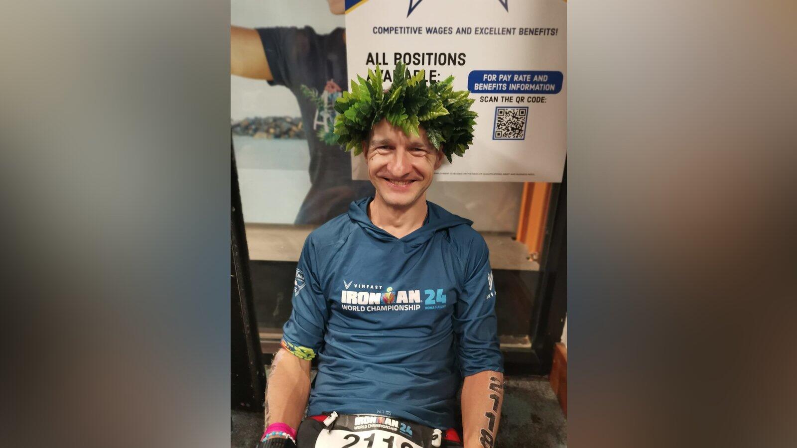Hans-Christoph Gallmeier im Ziel nach dem erfolgreich bestrittenen Ironman.