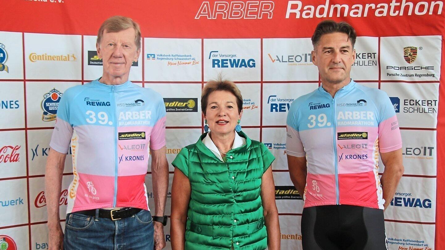 Schirmherr Walter Röhrl (links) und Alexander Koller vom Veloclub im neuen Trikot mit der Vereinsvorsitzenden Barbara Wilfurth.