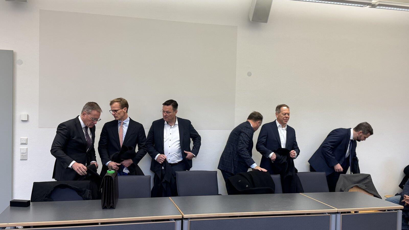 Bernhard Büllmann (Dritter von links) und Torsten Briegel (Zweiter von rechts) mit ihren Anwälten.