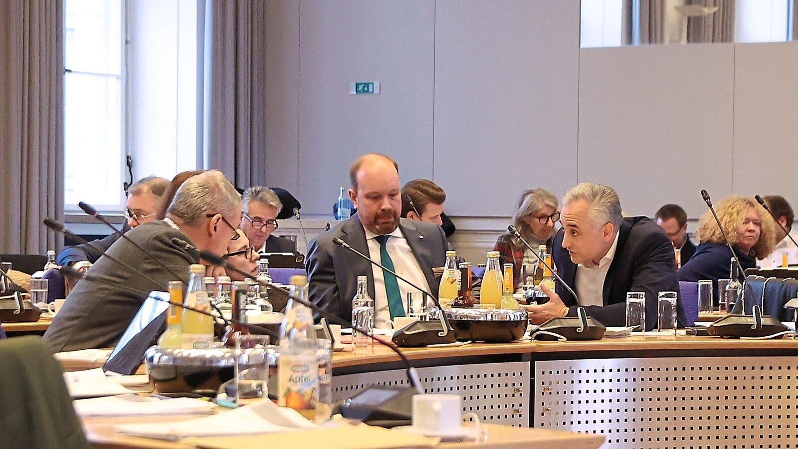 SPD-OB-Kandidat Thomas Burger (rechts) diskutiert mit Teilen der CSU-Fraktion. Beide Seiten hoffen, dass mit dem Bauturbo bald wieder mehr Wohnungen entstehen.