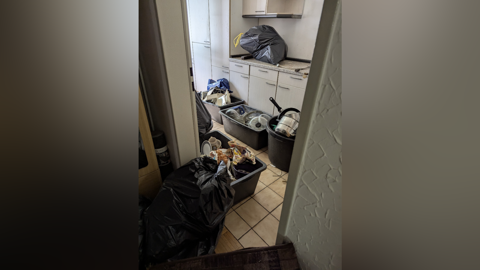 Ein Foto, das mehr über das Aussehen der Frau verrät oder Familienbilder sind nicht aufzufinden – vielleicht wurden sie schon von den Angehörigen geholt? Für Fragen und Vermutungen wie diese hat das Team jedoch keine Zeit. Heute sind sie nur zu fünft am Werk. Zwei sind in der Küche. An den Schranktüren der Küche und am Fensterbrett wimmelt es von kleinen Mücken. Neben zahlreichen Spinnenweben in den verschiedenen Ecken der Räume und den vertrockneten Pflanzen auf der Terrasse sind sie ein Zeichen dafür, dass die Wohnung wohl seit längerem unbewohnt ist. Lautes Scheppern und Klirren ist zu hören. Porzellan, Kochtöpfe und andere Küchenutensilien häufen sich in unterschiedlichen Wannen oder Plastiksäcken. „Meistens beginnen wir in der Küche und arbeiten uns dann Raum für Raum vor“, sagt Sidar. Zuerst das Kleine, dann das Große. Erst wenn die Schränke und Regale leergeräumt sind, kann man sie abmontieren.