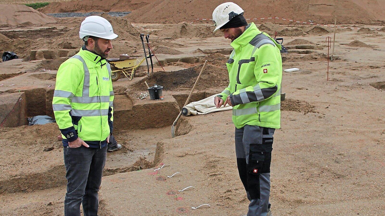 Grabungsleiter Benjamin Gademann (rechts) erklärt Tennet-Pressesprecher Johannes Prechtl, wie Pfostengruben und Stakenstandspuren entstehen.