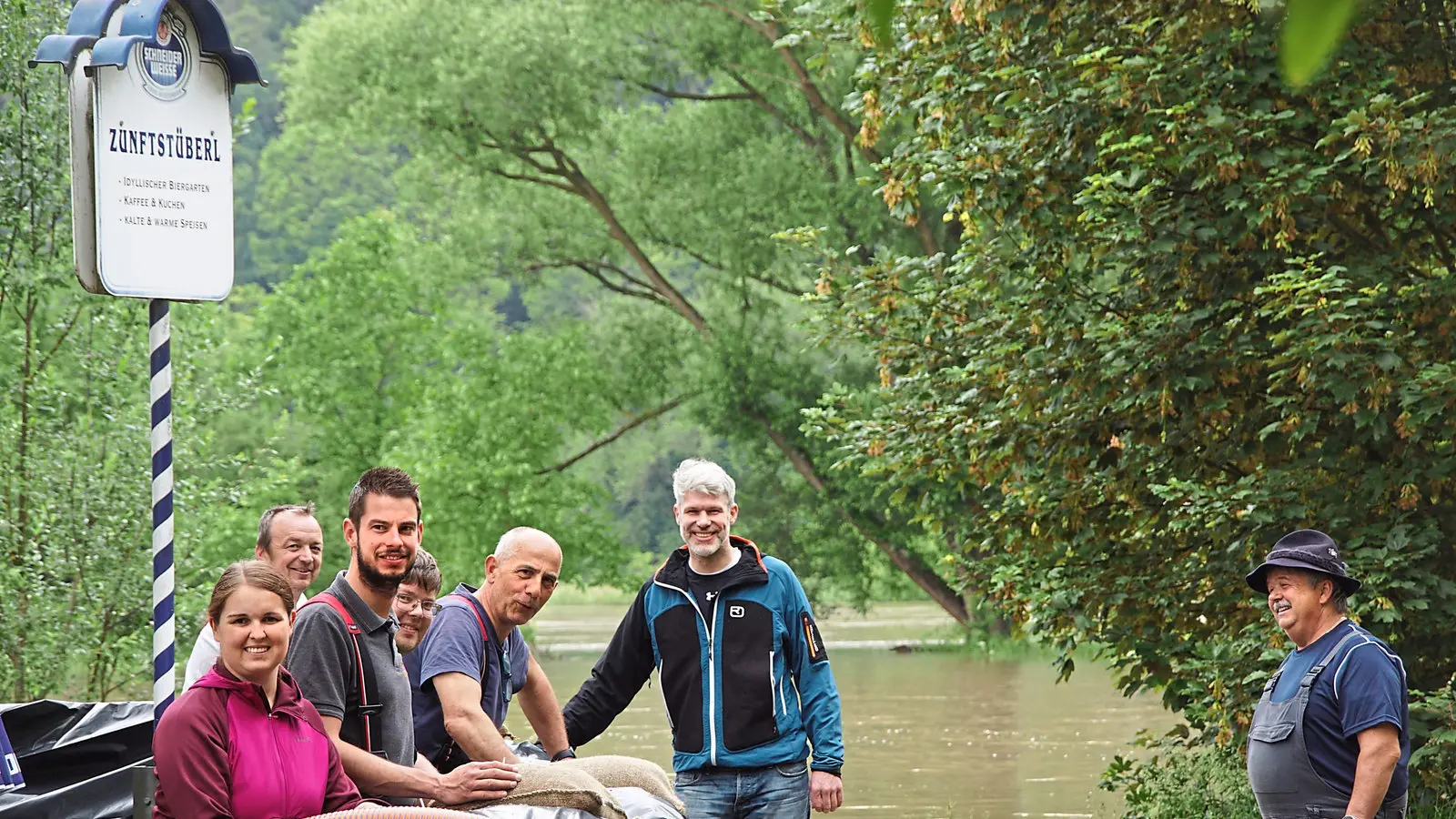 Das Zunftstüberl ist ein Ausflugslokal wie aus dem Bilderbuch. Direkt an der Donau gelegen, gleich bei der Mattinger Fähre. Ein lauschiger Biergarten, überdacht von Laubbäumen; Radler und Spaziergänger rasten hier gerne. Am Montag freilich trinkt niemand eine Biergartenhalbe: Tische, Stühle und Sonnenschirme sind auf die Seite geräumt, den Biergarten umspült eine bräunliche Brühe. Die Donau hat sich aus ihrem Bett erhoben und das Zunftstüberl eingekesselt.