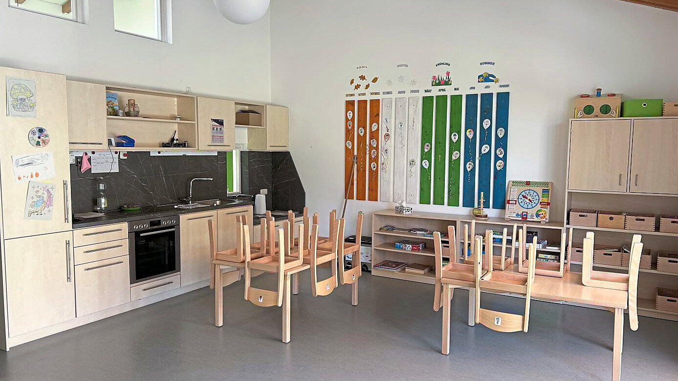 Blick in einen modernen Gruppenraum mit neuer Küchenzeile. In der Sanierungszeit waren viele Herausforderungen zu bewältigen.
