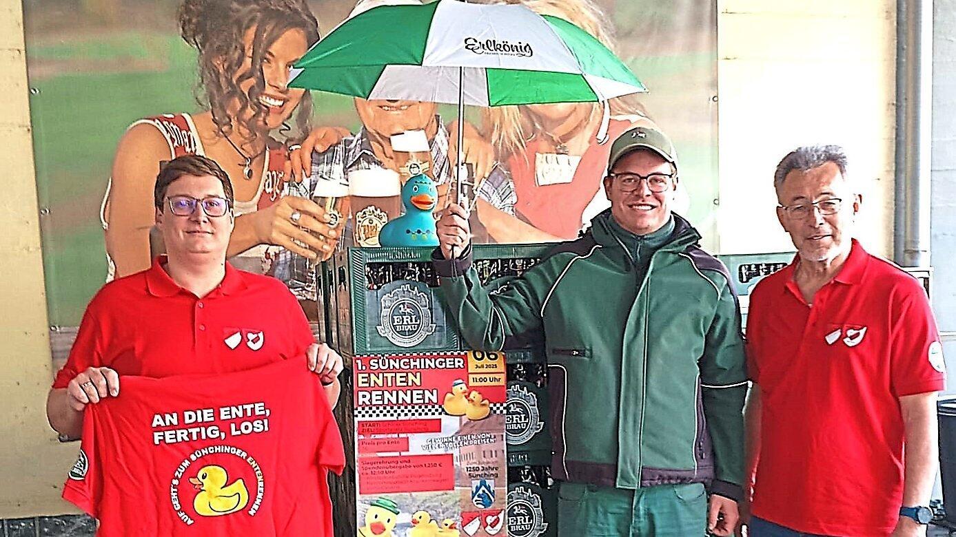 Die Schirmherrschaft des Entenrennens hat Braumeister Josef Erl übernommen. Die Vorsitzenden Thomas Gstettner (links) und Helmut Jende (rechts) freuen sich mit ihm.
