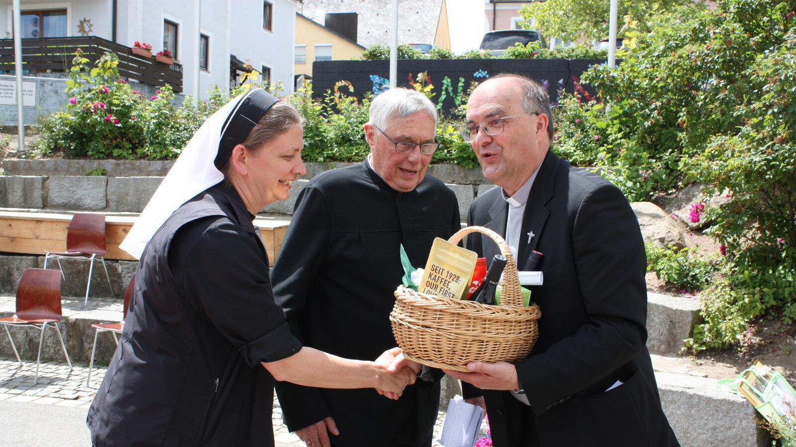 Pfarrer Adolf Schöls überreicht an Schwester Marion und Bruder Philippus einen Geschenkkorb und eine Geldspende.