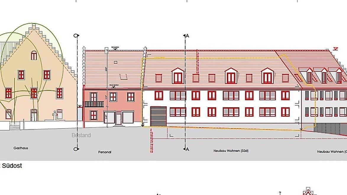So soll der Neubau des Schröttinger Areals aussehen, die Umrandungen kennzeichnen die Baumaßnahmen.
