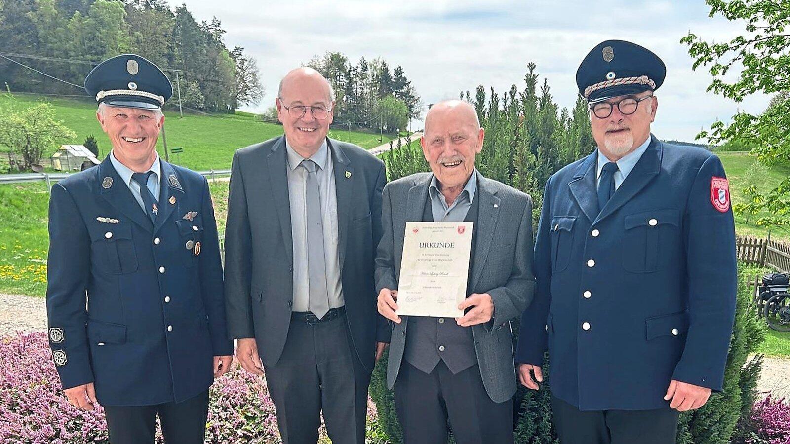Kommandant Stefan Bauer, Bürgermeister Alois Hamperl, Jubilar Piendl Luk und FFW-Vorsitzender Karl-Heinz Gratwohl (von links).