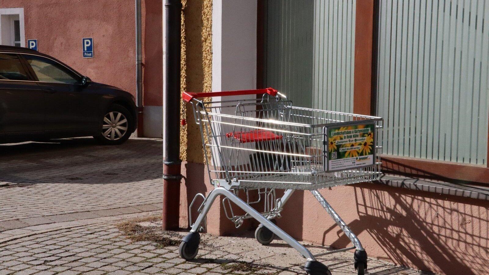 Seit guten drei Wochen steht der silberglänzende Einkaufswagen auf der Rückseite des ehemaligen Volksbank-Gebäudes.