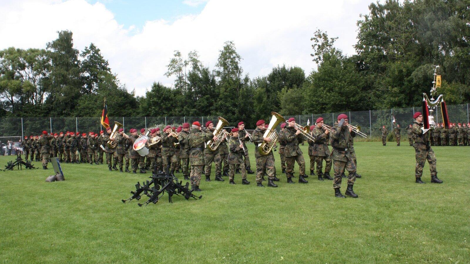 Das Heeresmusikkorps aus Veitshöchheim marschierte mit den Rekruten über den Rettenbacher Sportplatz.