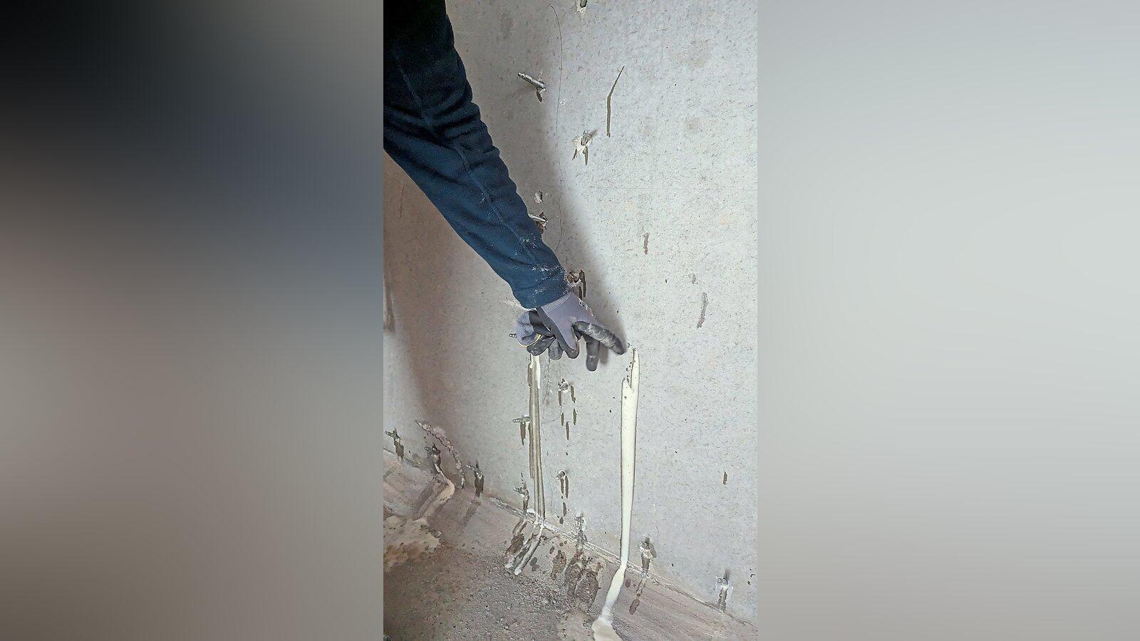 Ein Handwerker einer Fachfirma deutet auf einen Riss in einer Kellerwand, aus der nach dem Pressvorgang Kunstharz quillt: "Das ist gut, weil wir so sehen, dass es abdichtet."