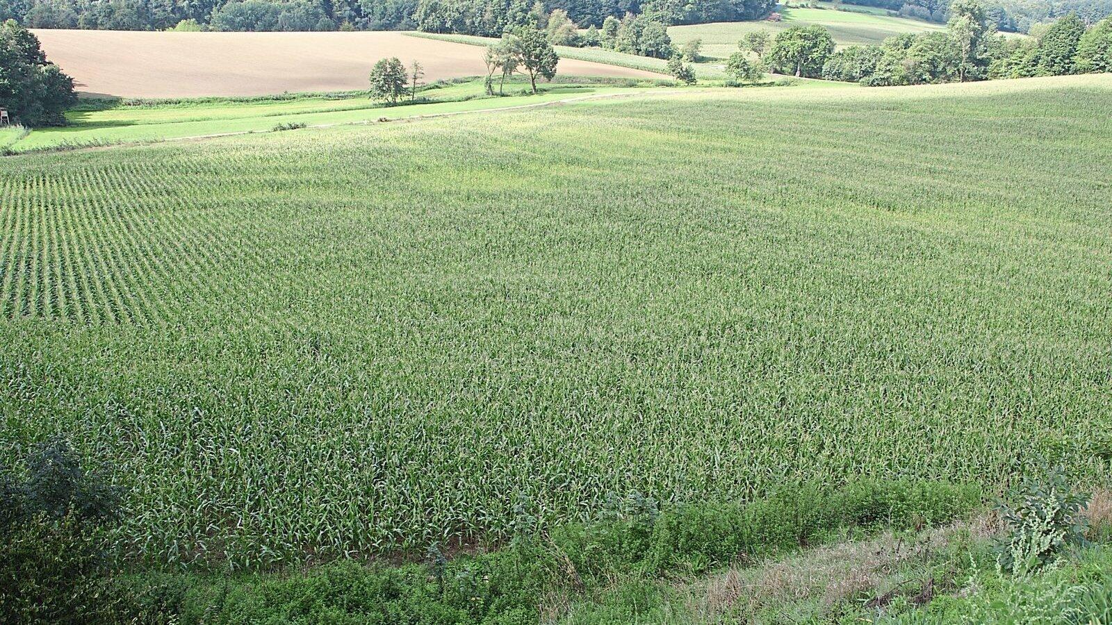 Blick in die Mulde beim Lehmhof, die derzeit mit Mais bepflanzt ist. Hier soll eine Deponie entstehen.