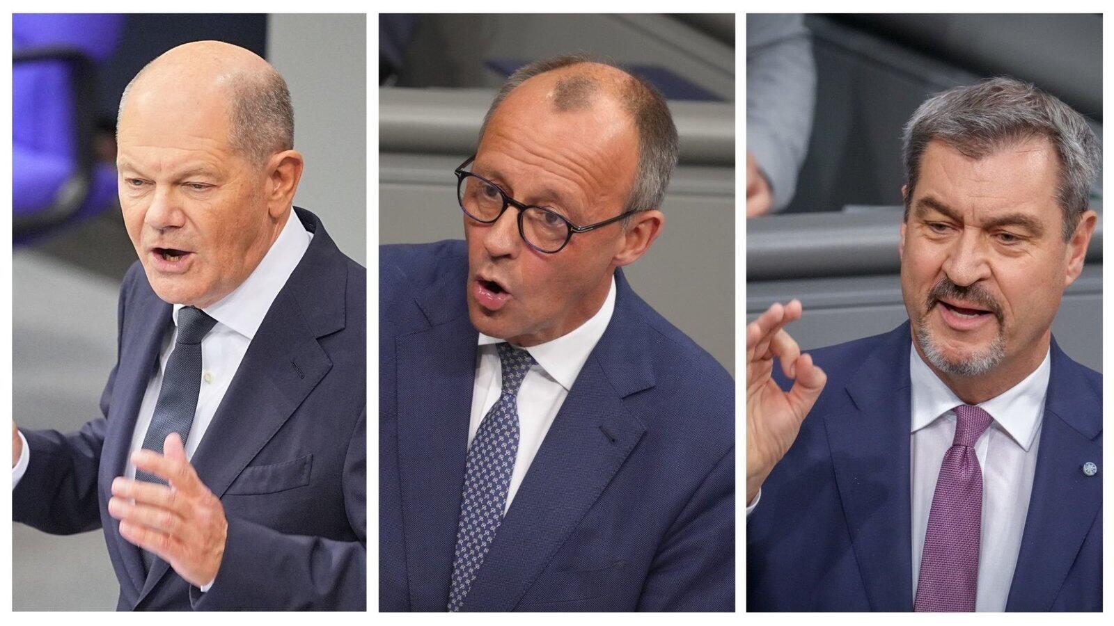 Olaf Scholz (links) gibt am Mittwoch eine Regierungserklärung ab - erklärt jedoch wenig. Bei Friedrich Merz (Mitte) stößt das auf wenig Begeisterung. Markus Söder wirft dem Kanzler gar stil- und würdeloses Handeln vor.