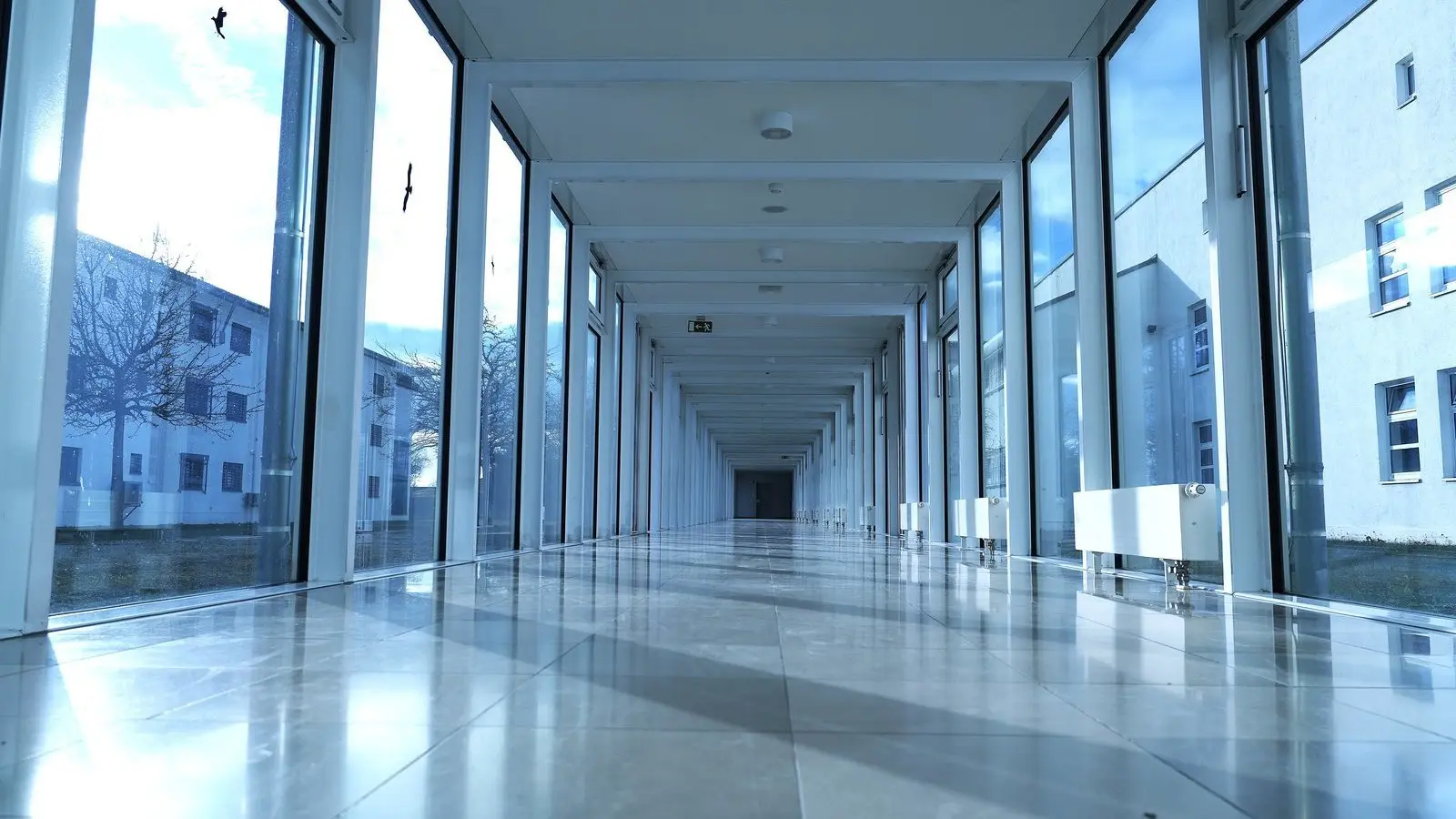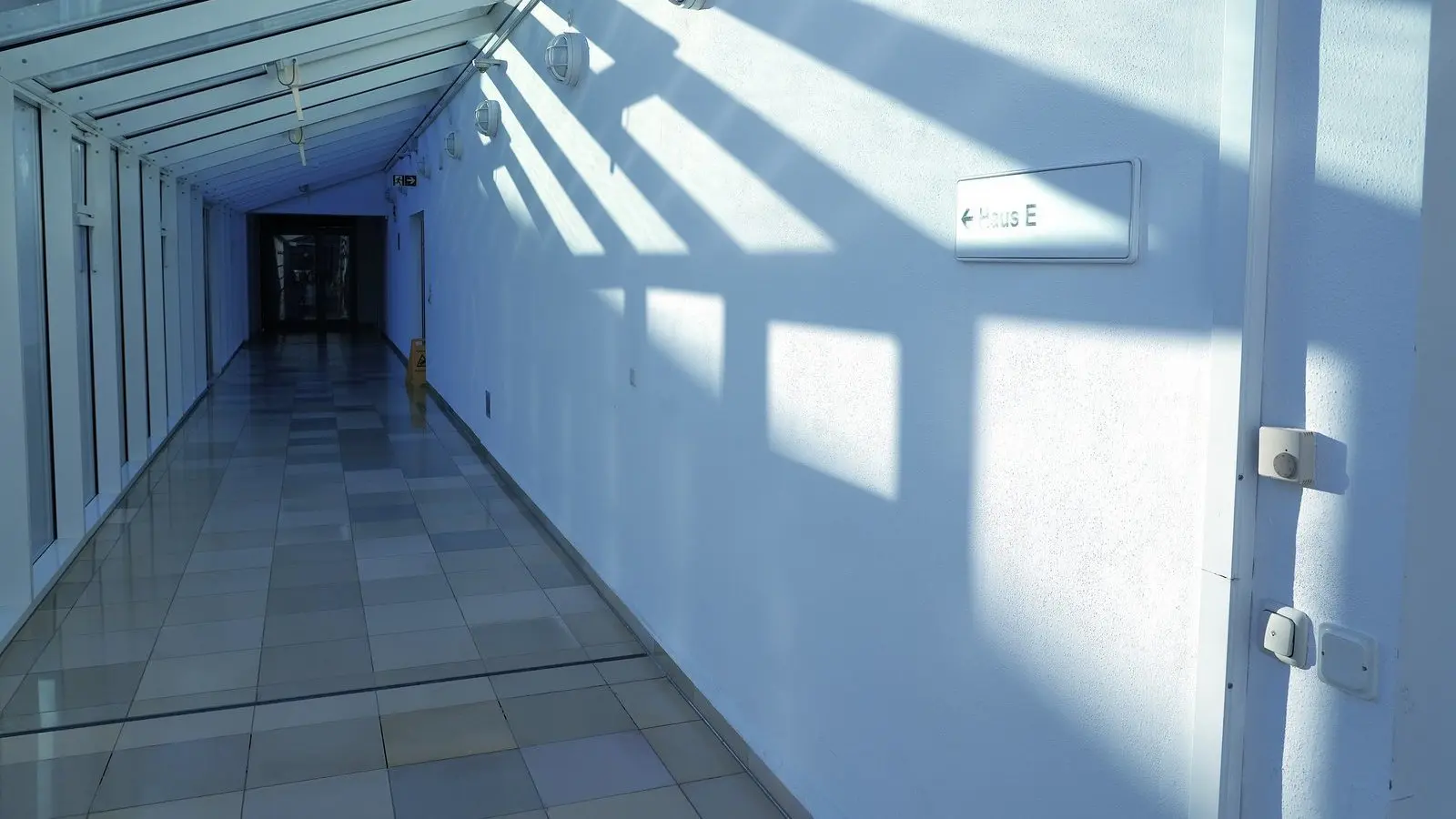 Die Häuser verbinden gerade, schmucklose Gänge mit Glaswänden, der längste zum F-Haus, 200 Schritte immer geradeaus. Durch das Glas sieht man vergitterte Fenster der Stationshäuser, oben den Himmel, unter dem Himmel beginnt die Mauer. Für eine Klinik mit rund 240 Patienten und 400 Mitarbeitern ist es erstaunlich still, die Gänge meist menschenleer.