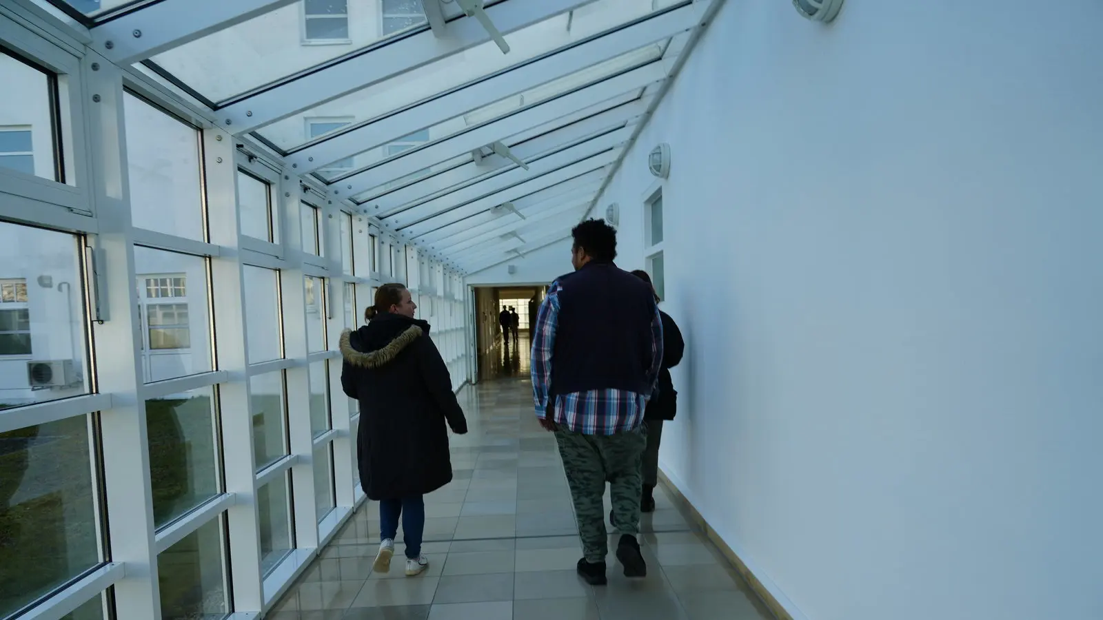 Als er warm genug angezogen ist, öffnen die Pflegerinnen die Stationstür ins Treppenhaus zu den langen Gängen der Klinik, vor zur Pforte. Auf dem Weg grüßt F. freudig alle Mitarbeiter, denen er begegnet. Die meisten grüßen zurück.