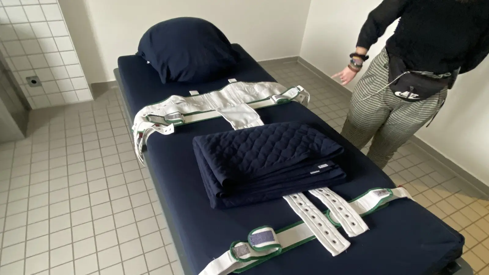 Er trägt das Notfalltelefon an der Hose, vier Pfleger begleiten ihn, zwei links, zwei rechts. Patienten auf dieser Station sind in Einzelzimmer gesperrt. Kein Fernseher, höchstens Radio aus scheppernden Lautsprechern. Bei manchen ist sogar der Heizkörper abgegittert, damit sie ihn nicht noch mal herausreißen. In einer Psychose entwickeln Menschen unglaubliche Kräfte. Patienten erhalten hier nur zweimal eine halbe Stunde täglich Hofgang. Davor müssen sie sich auf den Boden knien, Sicherheitsmitarbeiter legen ihnen Fußfesseln an, ketten die Hände an einen Bauchgurt. Kontakt sonst nur durch die Klappe in der Tür - doch sogar das ist gefährlich. Immer wieder mal schütten psychotische Patienten heiße Getränke durch die Öffnung, werfen Kot, reißen an Haaren, stechen in Augen.
