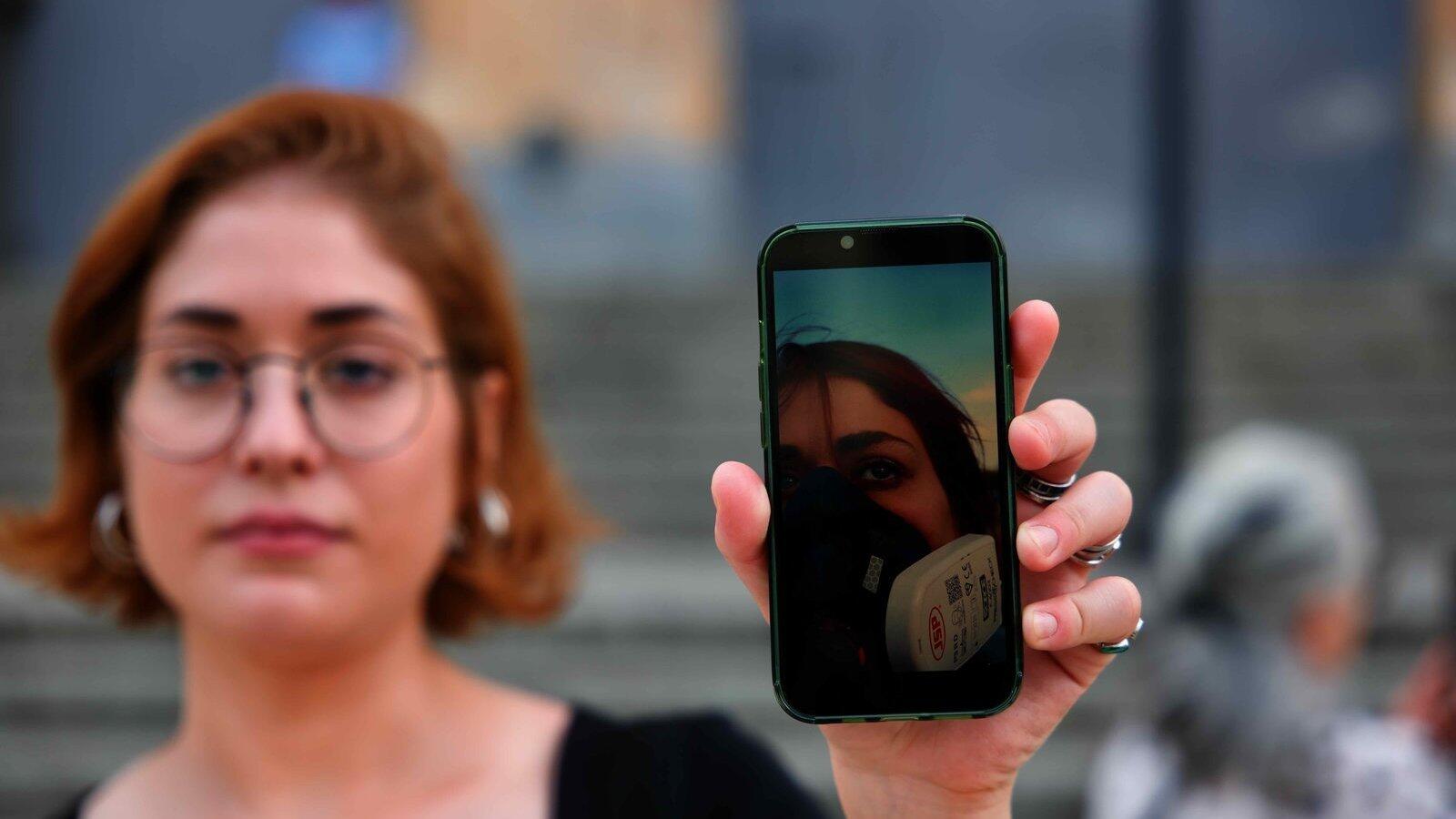Auf dem Smartphone von Ani Tavazde leuchtet ein Bild, das sie mit Gasmaske während einer Demo zeigt.