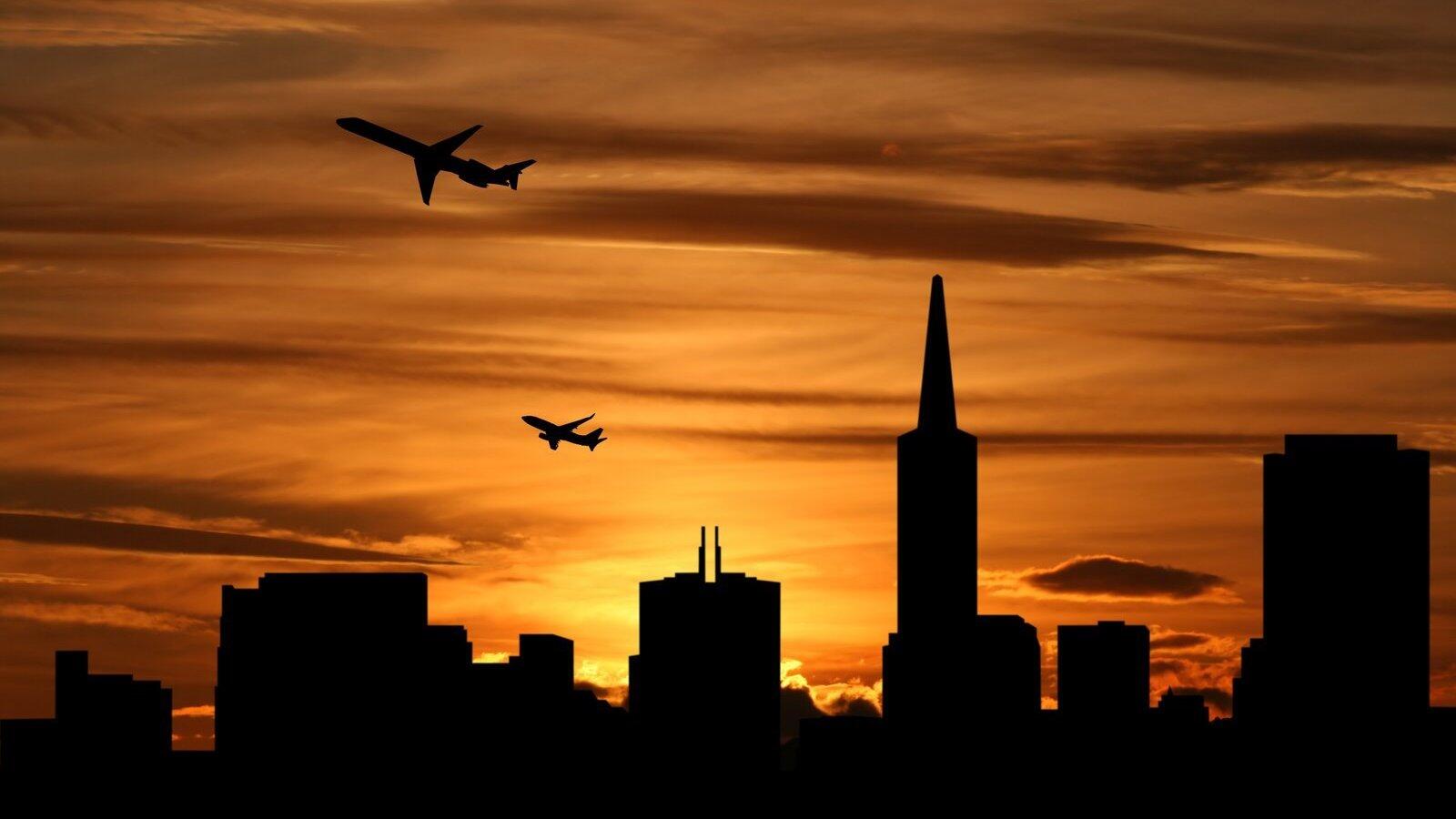 Zwei Maschinen überfliegen San Francisco und ein Wahrzeichen: die Transamerica Pyramide.