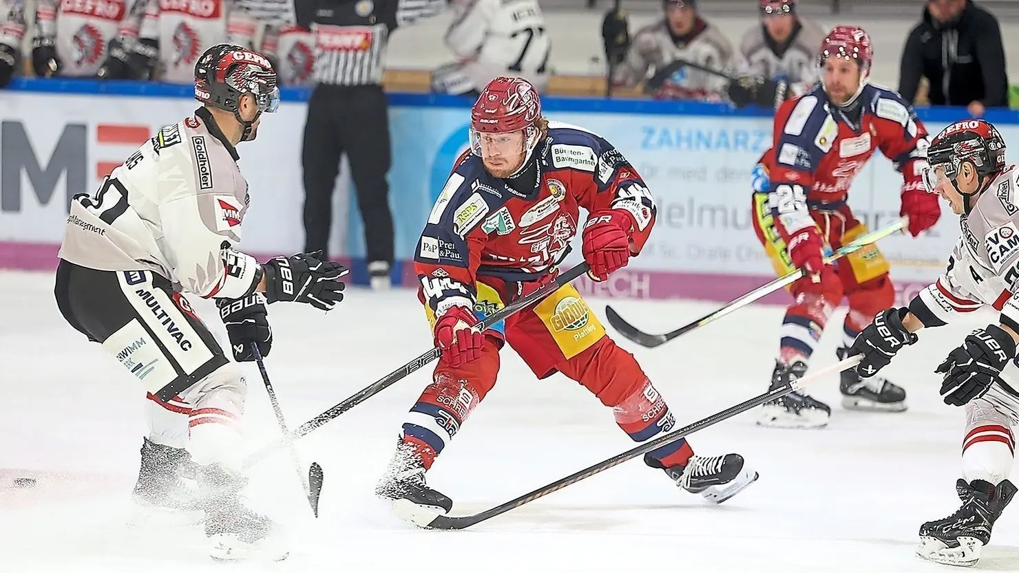 Deggendorfs Offensive um Marco Baßler (in rot) hatte in den fünf Spielen vor der Partie in Füssen 20 Tore erzielt, beim Schlusslicht aus dem Ostallgäu trafen die DSC-ler nur in der Verlängerung.