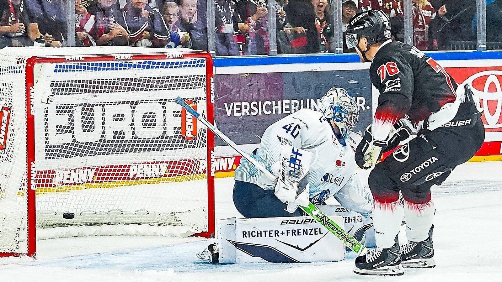 Einen von gleich mehreren erfolgreichen Kölner Kontern schließt hier Stürmer Nate Schnarr ab, der zum zwischenzeitlichen 4:4 trifft und den Haien den Weg zum späteren SIeg ebnet.