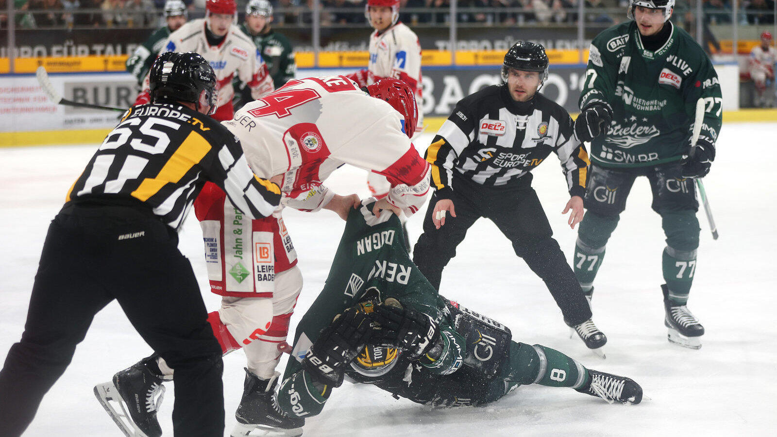Ordentlich zugepackt: Das hat nicht nur Colton Jobke (2. v. l.) im Faustkampf gegen Bietigheims Jack Dugan (am Boden) gemacht, sondern auch der EVL und die drei Punkte eingesackt.